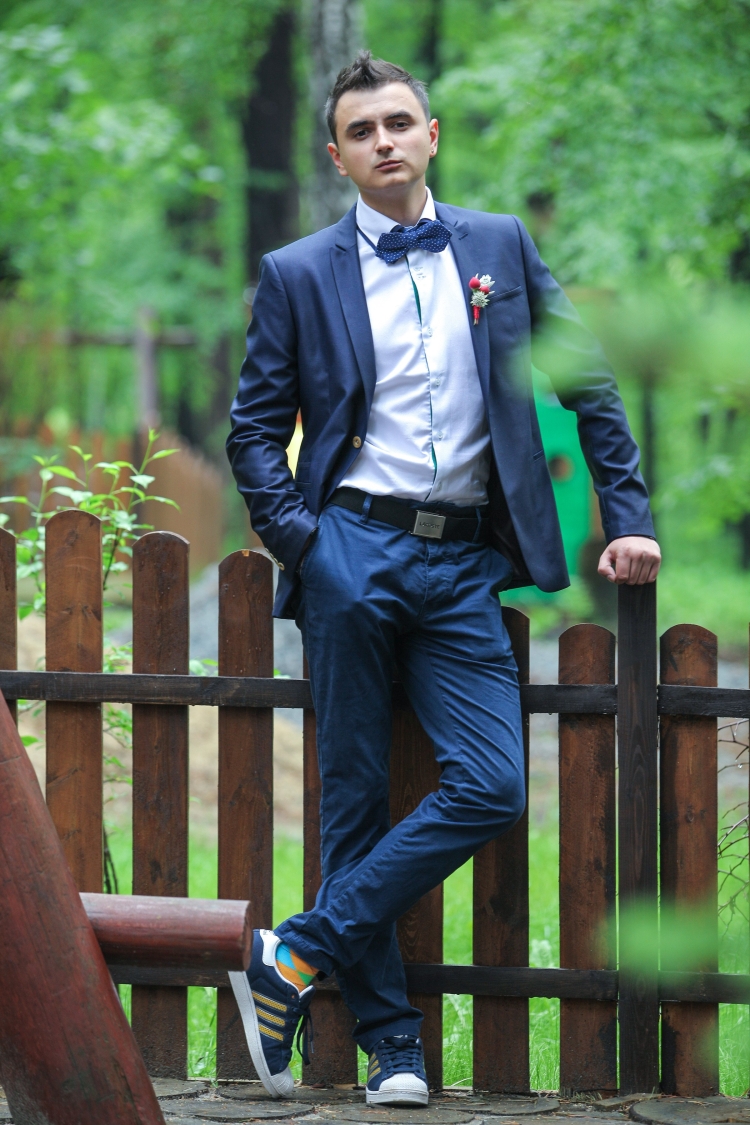 На этом фото мы можем увидеть элегантного жениха, который решил нестандартно подойти к своему образу и сочетает классический костюм с удобными и стильными кедами. Такое сочетание придаёт ему неповторимый и современный вид.