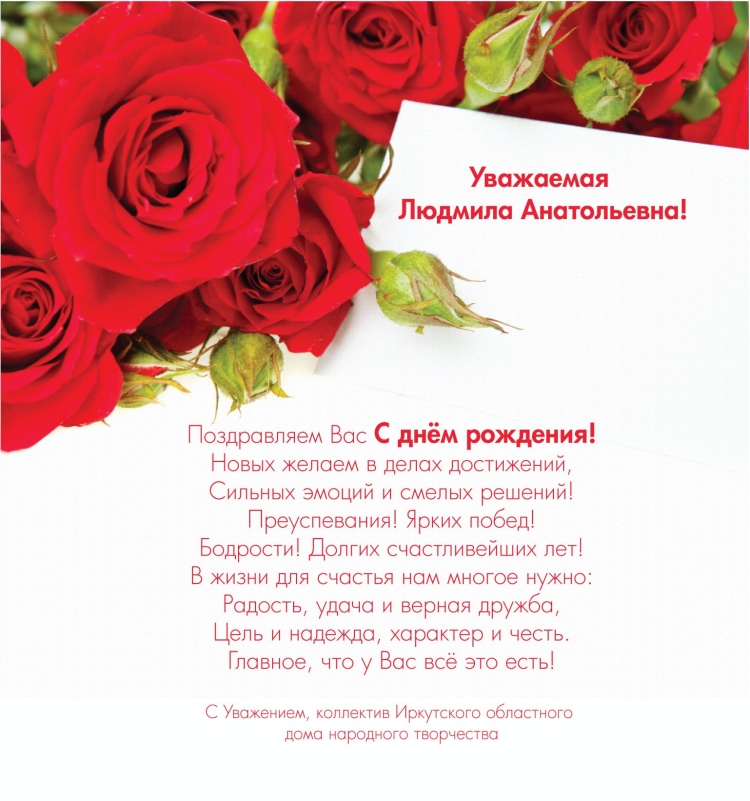 Желаю вам, Людмила Ивановна, чтобы каждый день был наполнен радостью, счастьем и успехом. Пусть грезы сбываются, а желания исполняются. Пусть вас окружает любовь, здоровье и благополучие.