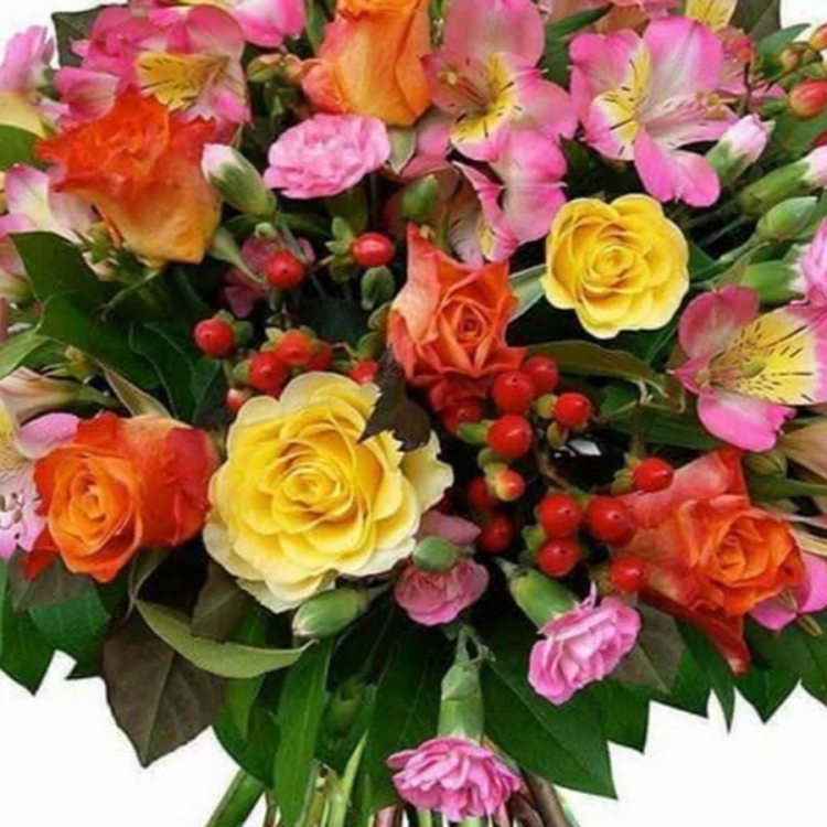 На переднем плане можно увидеть фееричный букет цветов различных оттенков и расцветок. Это словно гармония природы, воплощенная в живописном композиции. Цветочные мотивы символизируют красоту, нежность и надежность, что делает эту открытку еще более привлекательной.